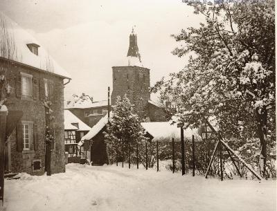 Ansichtskarte aus den 1950er Jahren. Links im Bild das Haus Burggraben Nr.1 Bildmitte: Beginn der Straße Burggraben. Rechts: Bergfried der alten Burg Bensberg.