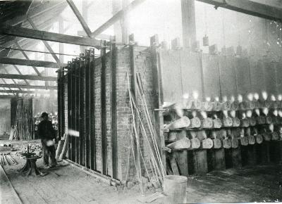 Ofenanlage des Verhüttungsbetriebes Zinkhütte. Im Vordergrund zeigen Arbeiter das Giessen von Zinkbarren.