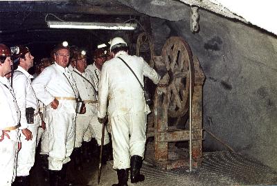 Die Kumpels auf unserem Foto entsteigen soeben den Förderkorb, der sie von der 8. Tiefbausohle (224 u. NN) ans Tageslicht gebracht hat. Es ist Schichtwechsel, erst wird noch geduscht und dann ab nach Hause.