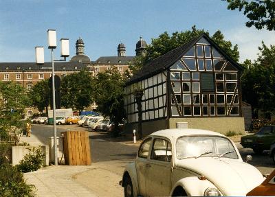 In Ermangelung von Unterichtsräumen für die musikalische Erziehung der Kinder erwarb die frühere Stadt Bensberg das Fachwerkhaus. Bei der Sanierung machte man eine erstaunliche Entdeckung und stellte dabei fest, dass das Haus infrüherer Zeit einmal einen engen Bezug zum "Alten Schloss" gehabt haben muss. Vielfältige Spuren, wie Getreidekörner in unzugänlichen Spalten und Fugen brachten es ans Tageslicht. In diesem Gebäude befand sich früher der Korn- und Getreidespeicher der früheren Burgherren. Nach dieser ersten Sanierung beherbergte dieses Haus über viele Jahre die Musikschule der Stadt Bensberg, zur damaligen Zeit die erste Musikschule im Rheinisch - Bergischen- Kreis. Nach der kommunalen Neugliederung wurde die Musikschule nach Bergisch Gladbach ausgegliedert. Das Haus stand daraufhin viele Jahre leer. Im Jahre 1996 erwarb Hans Krämer käuflich die ehemalige Musikschule. Da das alte Fachwerkhaus über keinen Keller verfügte wurde in einer spektakulären Aktion das entkerntes Gerippe mit einem 160 Tonnen- Kran vom Sockel gehoben und auf dem Rathaus Vorplatz bis zur Unterkellerung zwischengelagert.