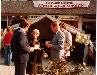 Überall, in Gaststädten, Geschäften, Apotheken, Banken usw. wurden Unterschriftenlisten ausgelegt. An zahlreichen Wochenenden wurden in der Bensberger Innenstadt und in Refrath Informationsstände aufgebaut, wo die Bevölkerung über Lautsprecher informiert und um Abgabe einer Unterschrift in der Namensfrage gebeten wurde. Es ging einzig und allein darum, dass der Name „Bensberg“ im Namen der neuen Stadt erhalten bleibt. Die Forderungan dieStadtverordneten lautete:Warum nicht Bensberg-Gladbach?