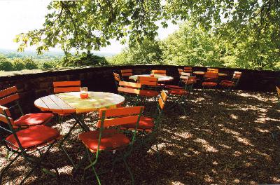 Auf der Terrasse lockt bei schönem Wetter dieser Biergarten mit einem herrlichen Blick auf Köln und die Kölner Bucht.